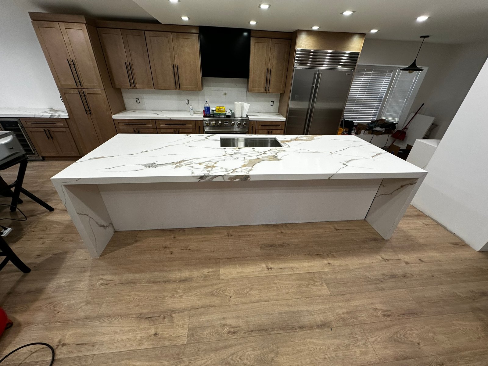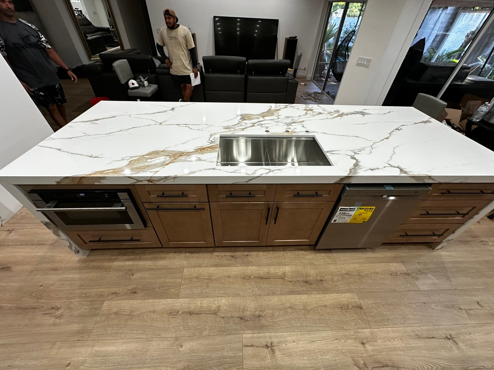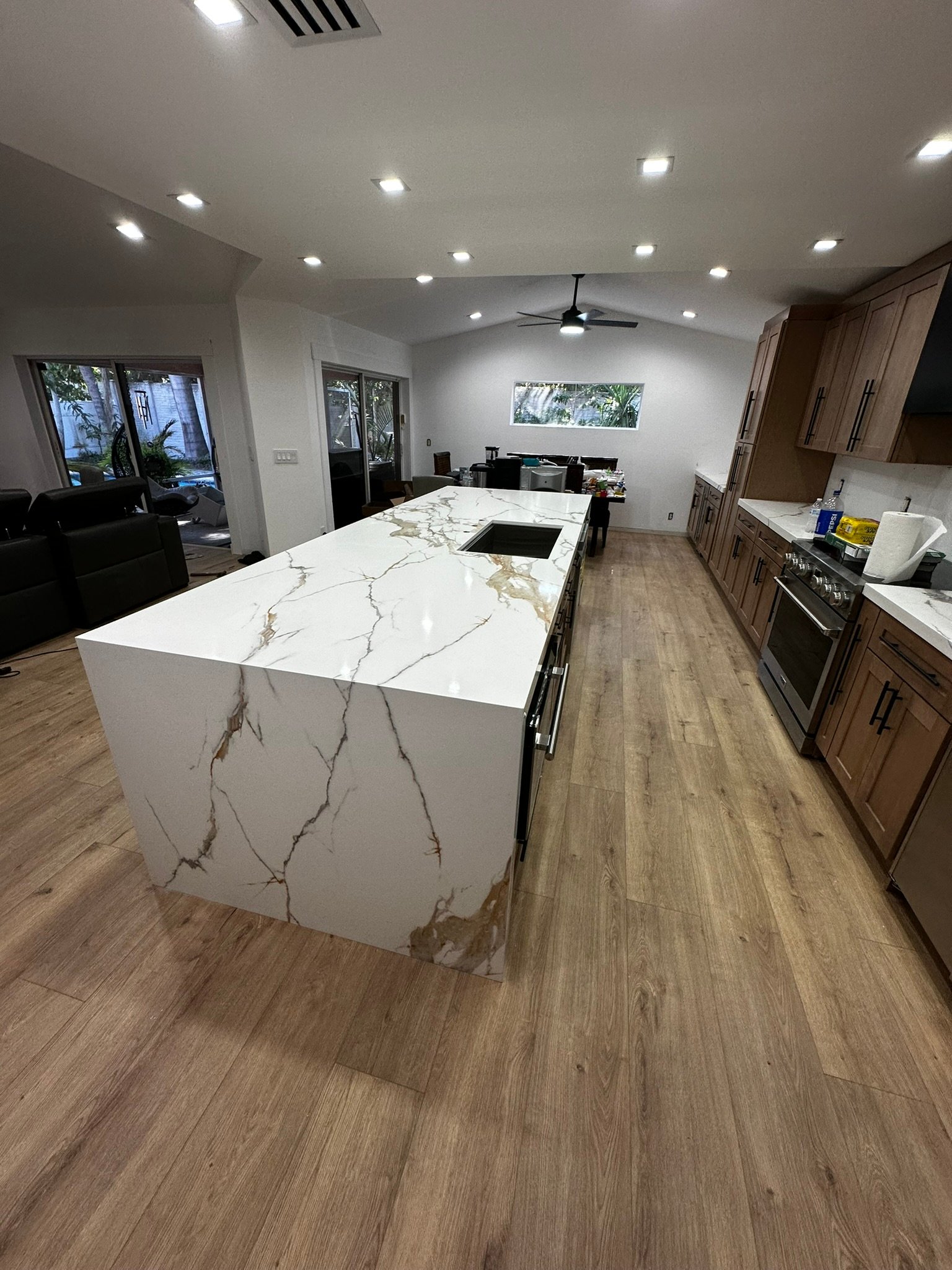 Este proyecto destaca por la instalación de una imponente isla central con cubierta de porcelanato tipo mármol, que combina funcionalidad y estética en un solo elemento. El diseño de concepto abierto permite una integración fluida con las áreas sociales, mientras que los acabados en madera natural y electrodomésticos empotrados refuerzan el estilo contemporáneo y sofisticado…