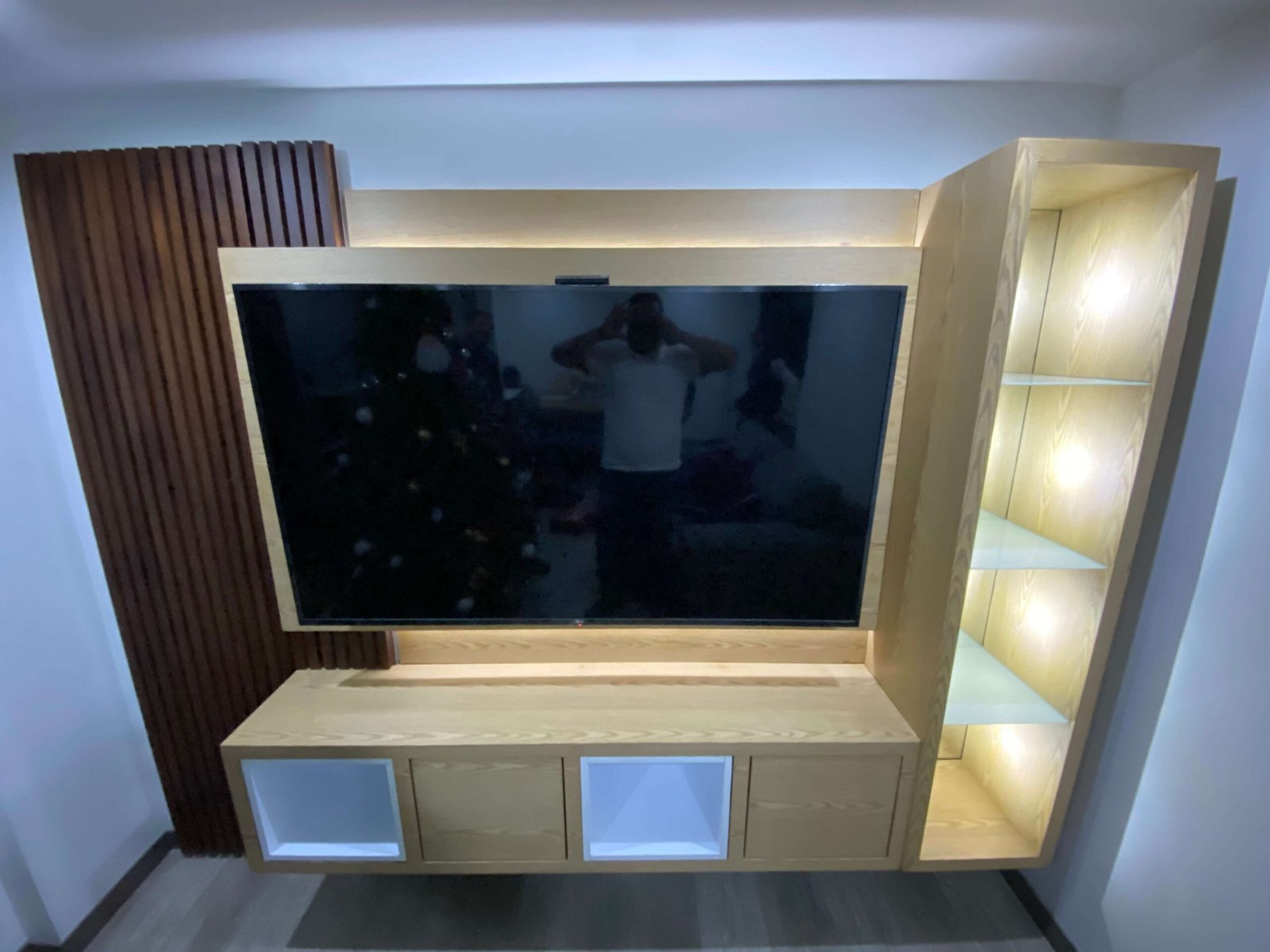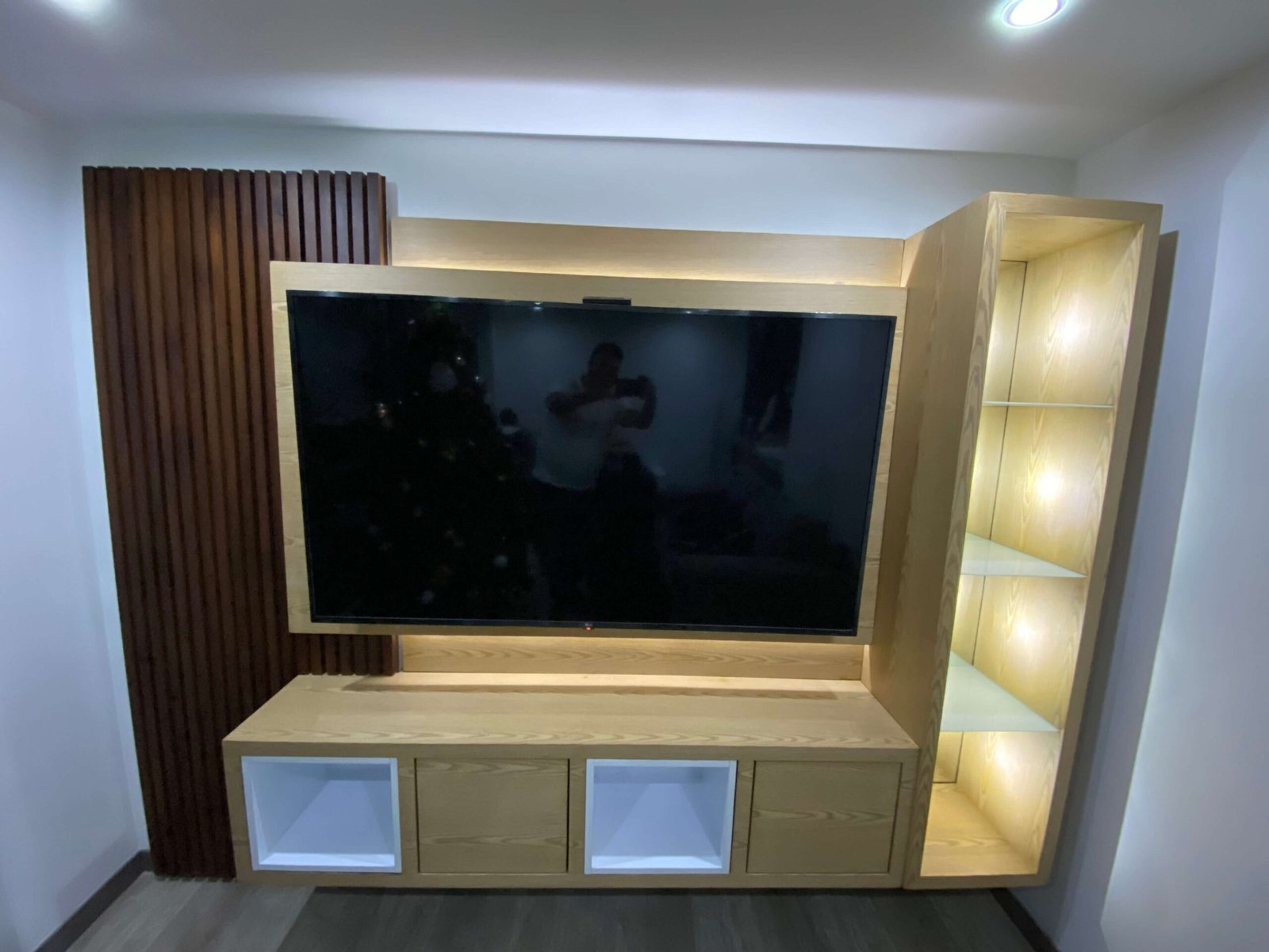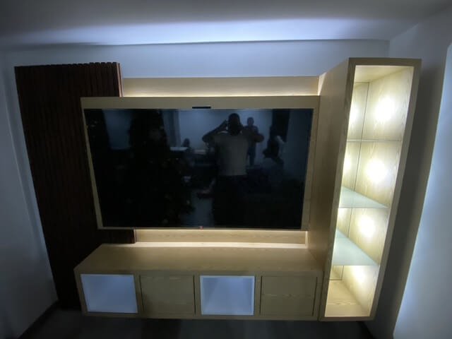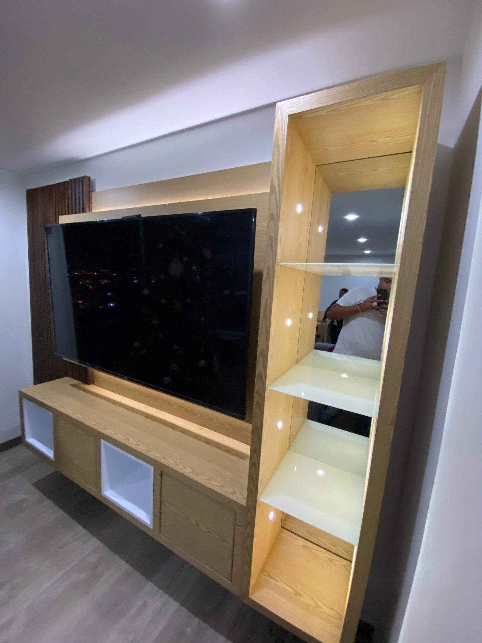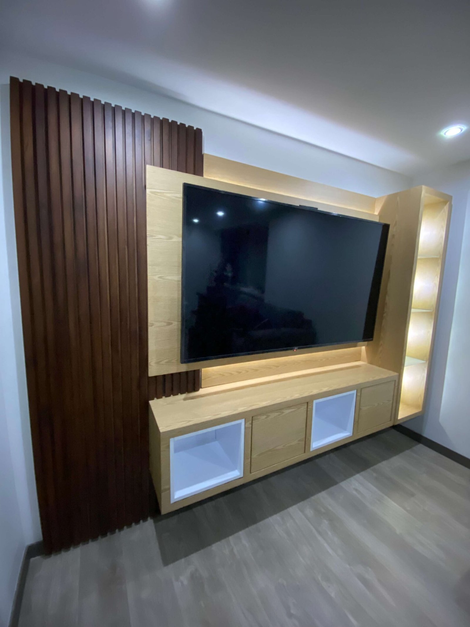 Centro de Entretenimiento a Medida Diseño moderno y funcional que combina madera clara con acentos en tonos oscuros, creando un contraste elegante y acogedor. 🔹 Panel con iluminación LED integrada que resalta la estructura y brinda calidez al ambiente. 🔹 Revestimiento tipo duela vertical en madera oscura para un toque de textura y estilo. 🔹…